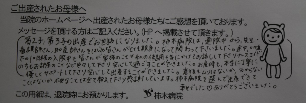 第2子、第3子の出産でお世話になりました。柿木病院は通院中から先生・看護師さん、助産師さんを始め皆さんがとても親身になって関わって下さいました。途中、切迫での一ヶ月程の入院中も皆さんが家族のことや私の体調も気にかけてお話して下さりナースエイドの方もお部屋のことなど色々して下さり安心して過ごすことができました。お産時も本当に丁寧に優しくサポートして下さり安心して出産することができました。産後も無理はないか、分からないことはないか不安なことは全て教えて下さり感謝しています。柿木病院を選んで出産できて幸せでした♡ありがとうございました。
