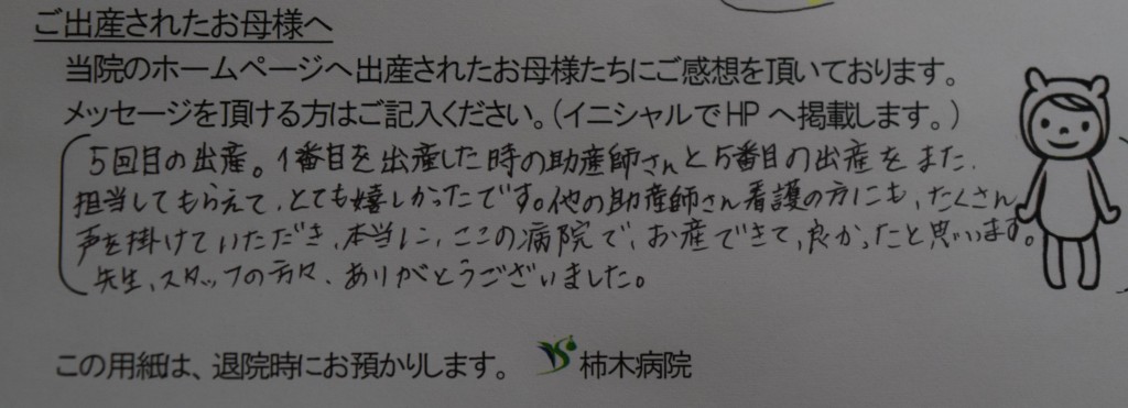 5回目の出産。1番目を出産した時の助産師さんと5番目の出産をまた担当してもらえて、とても嬉しかったです。他の助産師さん看護の方にもたくさん声を掛けていただき、本当にここの病院でお産できて良かったと思います。先生、スタッフの方々、ありがとうございました。