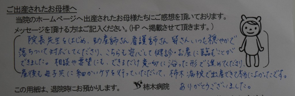 院長先生をはじめ、助産師さん看護師さん皆さんいつも穏やかで落ち着いて対応してくださり、こちらも安心して健診・お産に臨むことができました。相談や要望にもできるだけ意向に沿った形で進めてくださり、産後も母子共に細かいケアを行っていただいて、柿木病院で出産できて本当によかったです。ありがとうございました。