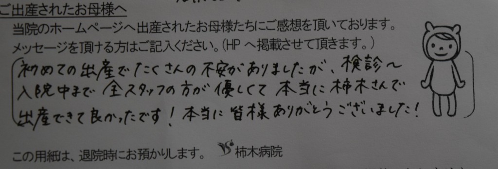 初めての出産でたくさんの不安がありましたが、検診~入院中まで全スタッフの方が優しくて本当に柿木さんで出産できて良かったです!本当にありがとうございました!