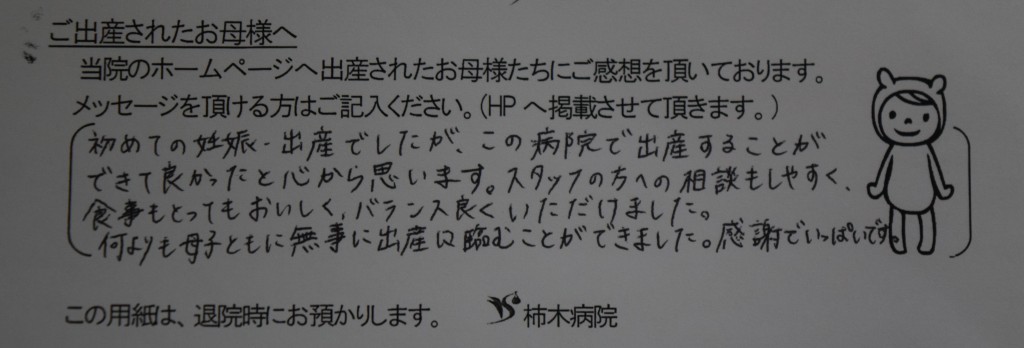 初めての妊娠・出産でしたがこの病院で出産することができて良かったと心から思います。スタッフの方への相談もしやすく、食事もとってもおいしく、バランス良くいただけました。<br />
