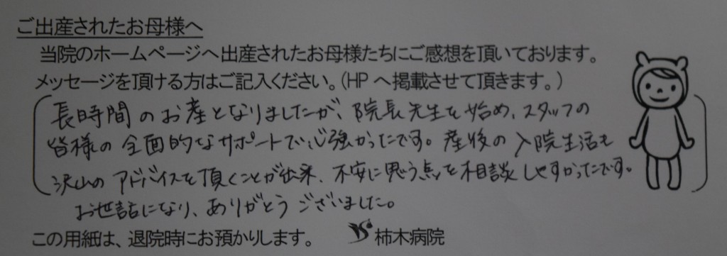 長時間のお産となりましたが、院長先生をはじめ、スタッフの皆様の全面的なサポートで心強かったです。産後の入院生活も沢山のアドバイスを頂くことができ、不安に思う点を相談しやすかったです。<br />