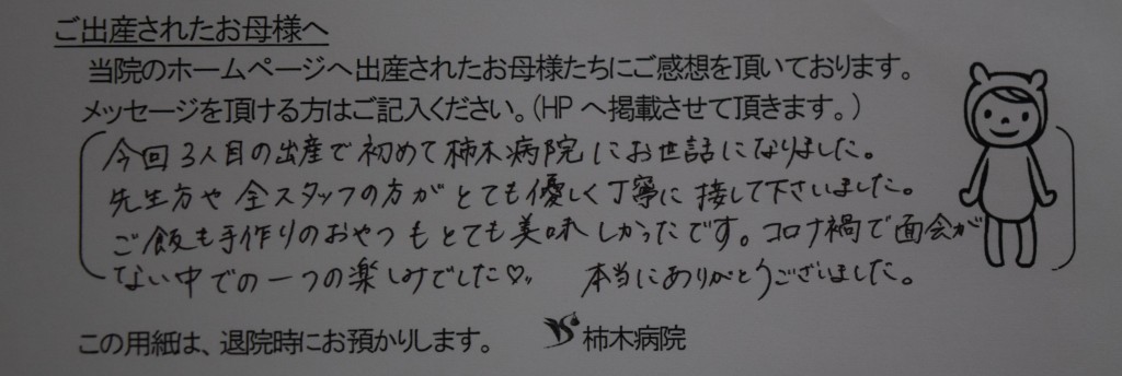 今回3人目の出産で初めて柿木病院にお世話になりました。先生方や全スタッフの方がとても優しく丁寧に接して下さいました。<br />