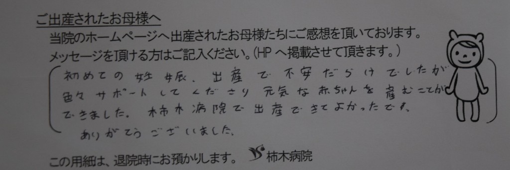 初めての妊娠・出産で不安だらけでしたが、色々サポートしてくださり元気な赤ちゃんを産むことができました。柿木病院で出産できてよかったです。<br />