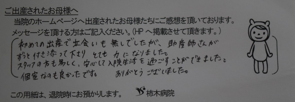 初めての出産で立会いも無しでしたが、助産師さんがずっと付き添って下さり、とても力になりました。<br />