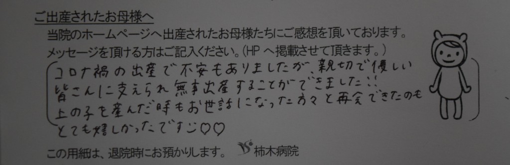 コロナ禍の出産で不安もありましたが、親切で優しい皆さんに支えられ無事出産することができました!!<br />