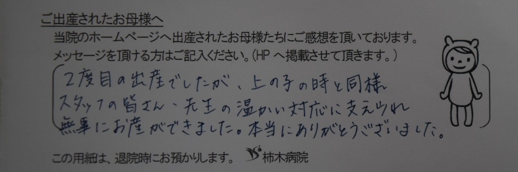 2度目の出産でしたが上の子の時と同様、スタッフの皆さん、先生の温かい対応に支えられ、無事にお産ができました。本当にありがとうございました。