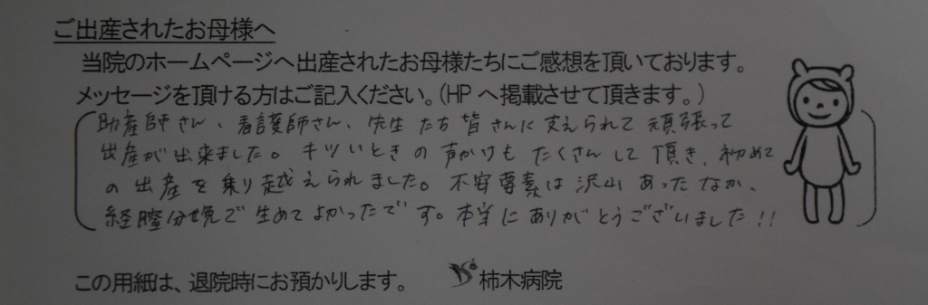 助産師さん、看護師さん、先生たち皆さんに支えられて頑張って出産が出来ました。キツいときの声かけもたくさんして頂き、初めての出産を乗り越えられました。不安要素は沢山あったなか、経腟分娩で生めてよかったです。本当にありがとうございました!