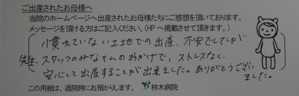 慣れていない土地での出産、不安でしたが先生・スタッフのみなさんのおかげでストレスなく、安心して出産することが出来ました。ありがとうございました。