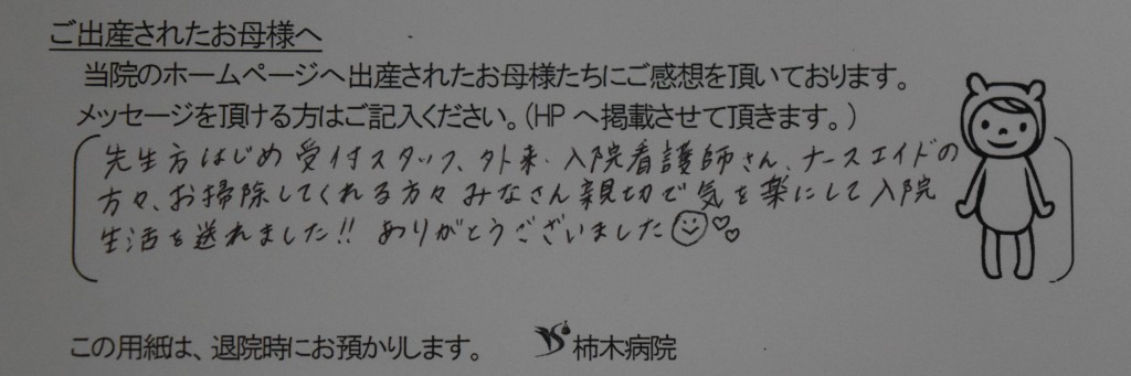 先生方はじめ受付スタッフ、外来、入院看護師さん、ナースエイドの方々、お掃除してくれる方々みなさん親切で気を楽にして入院生活を送れました!!ありがとうございました☻♡