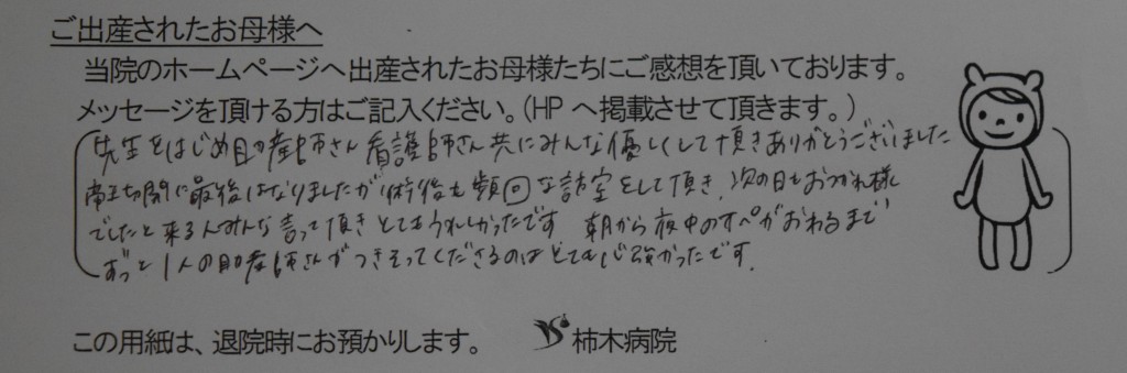 先生をはじめ助産師さん看護師さん共にみんな優しくして頂き、ありがとうございました。帝王切開に最後はなりましたが、術後も頻回な訪室をして頂き、次の日もお疲れさまでしたと来る人みんな言って頂き、とても嬉しかったです。朝から夜中のオペが終わるまでずっと一人の助産師さんが付き添ってくださるのはとても心強かったです。