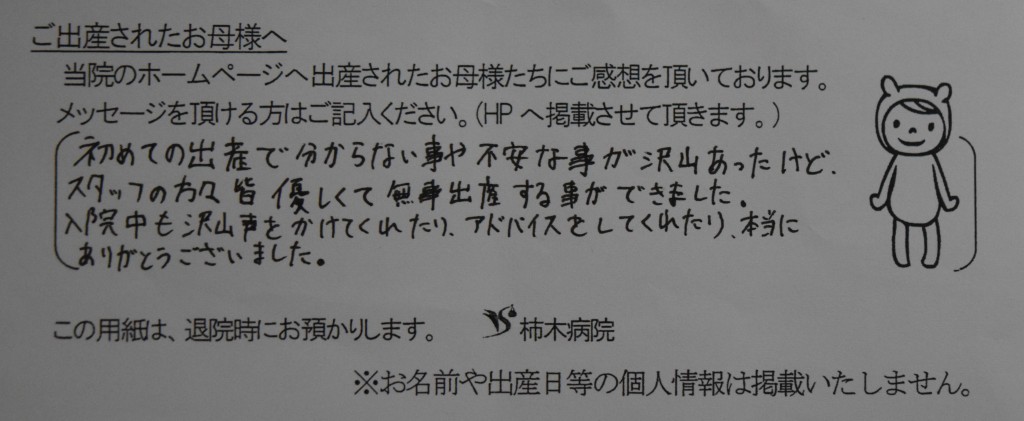 初めての出産で分からない事や不安な事が沢山あったけど、スタッフの方々みんな優しくて無事出産する事ができました。<br />