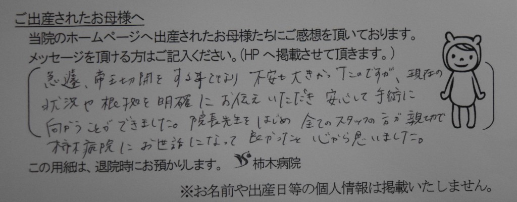 急遽、帝王切開をする事となり、不安も大きかったですが、現在の状況や根拠を明確にお伝えいただき安心して手術に向かうことができました。院長先生をはじめ全てのスタッフの方が親切で柿木病院にお世話になって良かったと心から思いました。
