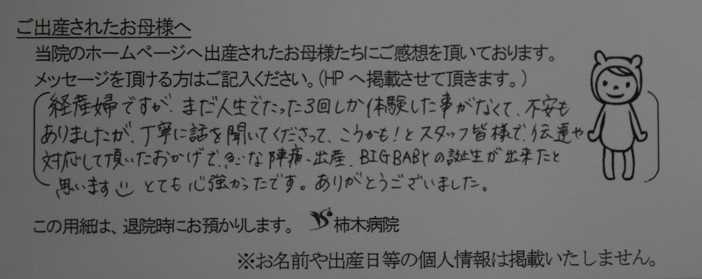 経産婦ですが、まだ人生でたった3回しか体験した事がなくて、不安もありましたが丁寧に話を聞いてくださって、こうかも!とスタッフ皆様で伝達や対応して頂いたおかげで急な陣痛、出産、BIGBABYの誕生が出来たと思います☻とても心強かったです。ありがとうございました。