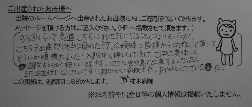 33週くらいで急遽こちらにお世話になることになりましたが、こちらで出産できて本当に良かったです。分娩時に皆様からはげまして頂いてどうにか頑張れました!!入院中も優しくして頂け、ごはんも美味しく退院するのが寂しい程です。次また鹿児島で出産するとなったらまたお世話になりたいです!!あたたかい病院でした。ありがとうございました。