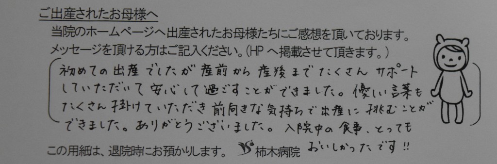 初めての出産でしたが、産前から産後までたくさんサポートしていただいて安心して過ごすことができました。優しい言葉もたくさん掛けていただき前向きな気持ちで出産に挑むことができました。ありがとうございました。入院中の食事、とってもおいしかったです!!