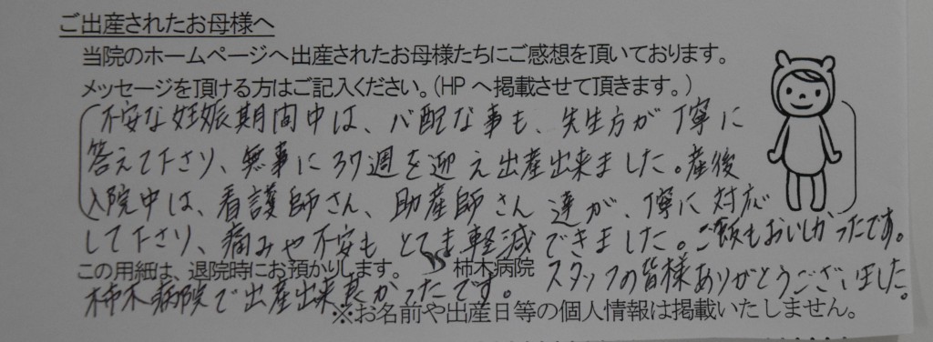 不安な妊娠期間中は、心配な事も、先生方が丁寧に答えて下さり、無事に37週を迎え出産出来ました。産後入院中は看護師さん、助産師さん達が丁寧に対応して下さり、痛みや不安もとても軽減できました。ご飯もおいしかったです。柿木病院で出産でき良かったです。スタッフの皆様ありがとうございました。