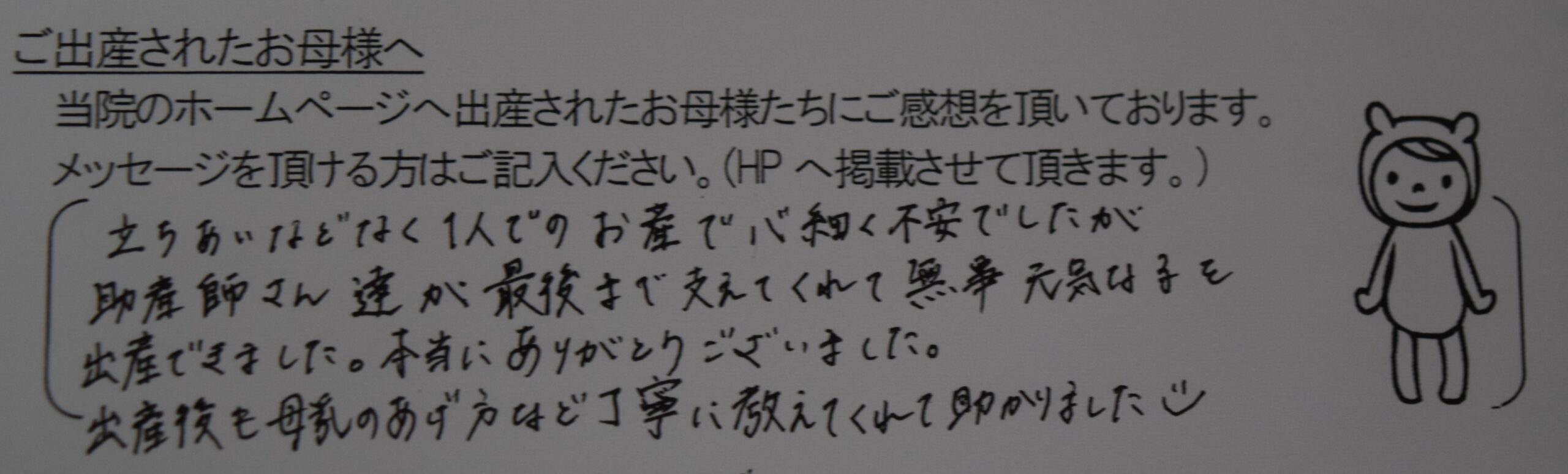 立ち会いなどなく1人でのお産で心細く不安でしたが、助産師さん達が最後まで支えてくれて無事元気な子を出産できました。本当にありがとうございました。<br />
