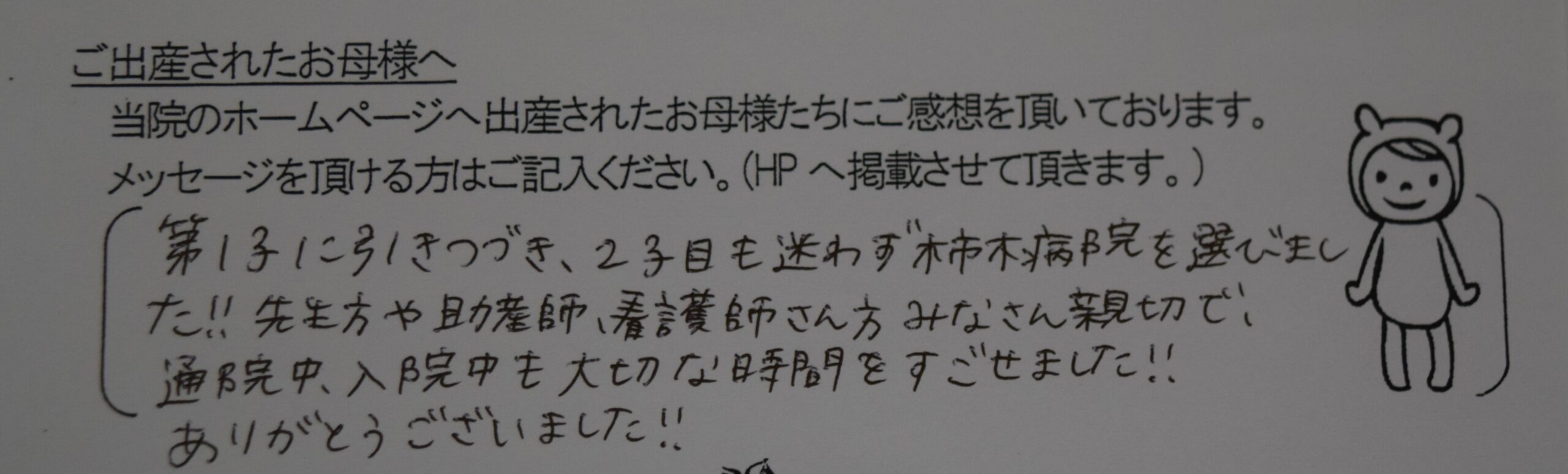 第1子に引きつづき、2子目も迷わず柿木病院を選びました!!先生方や助産師、看護師さん方みなさん親切で通院中、入院中も大切な時間を過ごせました!!<br />
