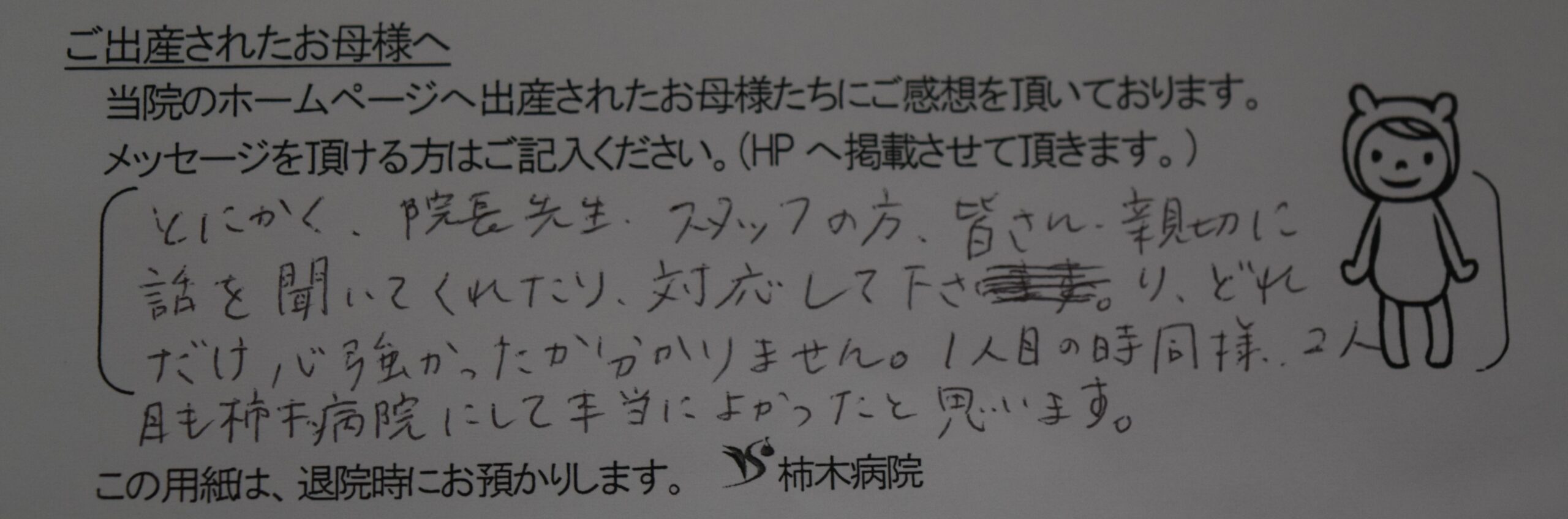 とにかく院長先生、スタッフの方、皆さん、親切に話を聞いてくれたり、対応して下さり、どれだけ心強かったか分かりません。1人目の時同様、2人目も柿木病院にして本当によかったと思います。