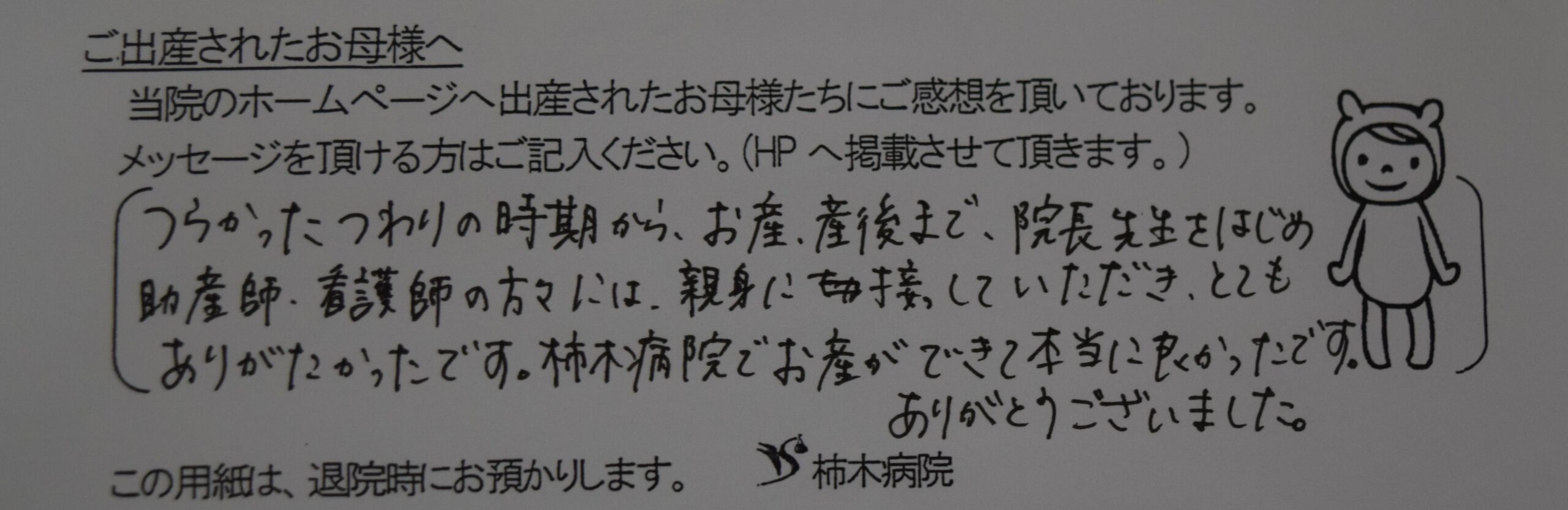 つらかったつわりの時期からお産、産後まで院長先生をはじめ助産師、看護師の方々には親身に接していただき、とてもありがたかったです。柿木病院でお産ができて本当に良かったです。ありがとうございました。