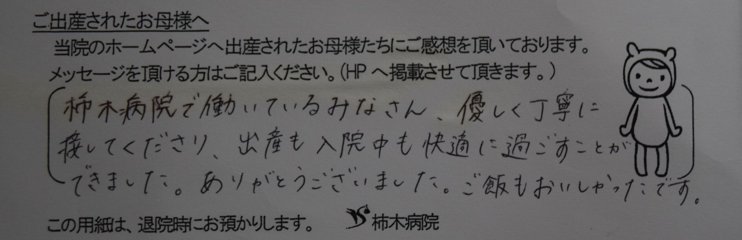 柿木病院で働いているみなさん、優しく丁寧に接してくださり、出産も入院中も快適に過ごすことができました。ありがとうございました。ご飯も美味しかったです。