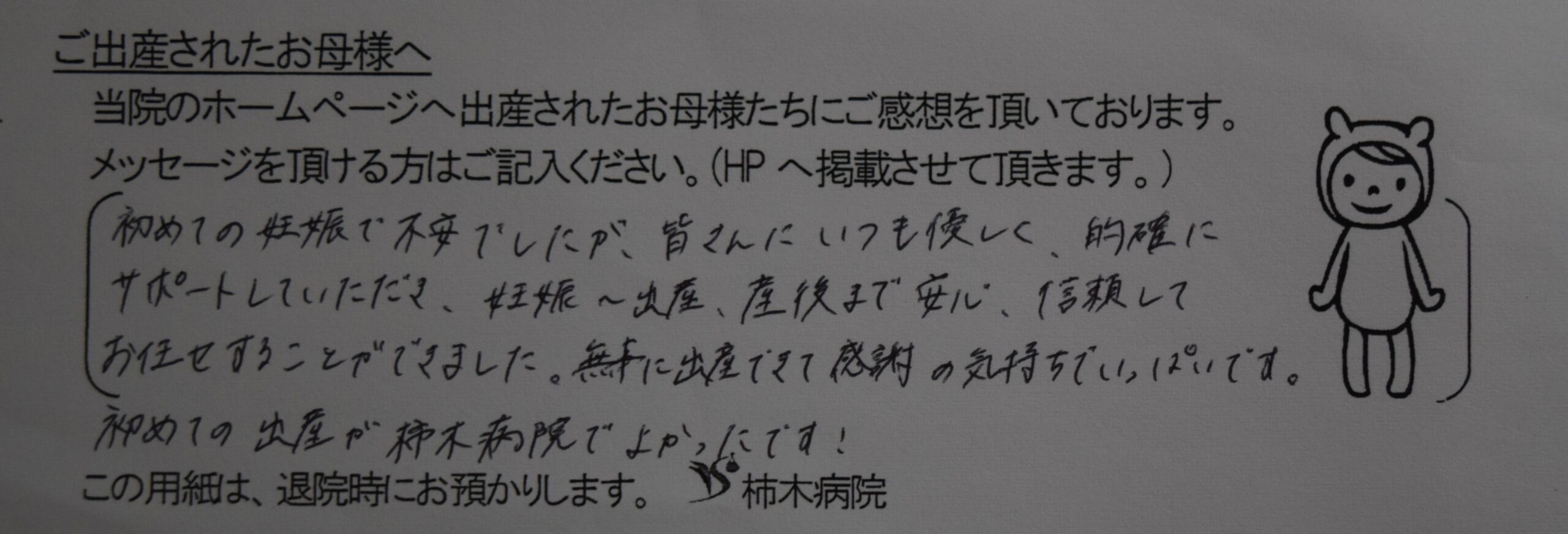 初めての妊娠で不安でしたが、皆さんにいつも優しく、的確にサポートしていただき、妊娠~出産、産後まで安心、信頼してお任せすることができました。無事に出産できて感謝の気持ちでいっぱいです。<br />