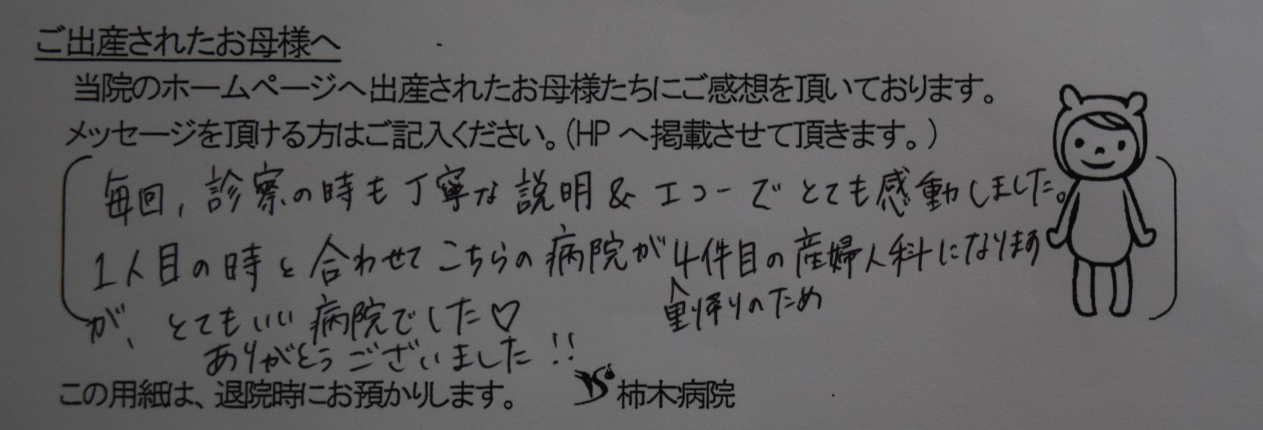 毎回、診察の時も丁寧な説明&エコーでとても感謝しました。1人目の時と合わせてこちらの病院が里帰りのため4件目の産婦人科になりますが、とてもいい病院でした♡ありがとうございました!!