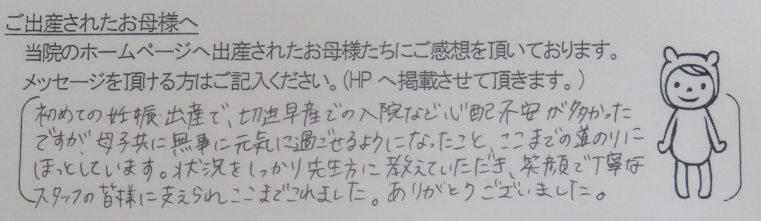 初めての妊娠・出産で、切迫早産での入院など、心配不安が多かったですが、母子共に無事に元気に過ごせるようになったこと、ここまでの道のりにほっとしています。状況をしっかり先生方に教えていただき、笑顔で丁寧なスタッフの皆様に支えられ、ここまでこれました。ありがとうございました。