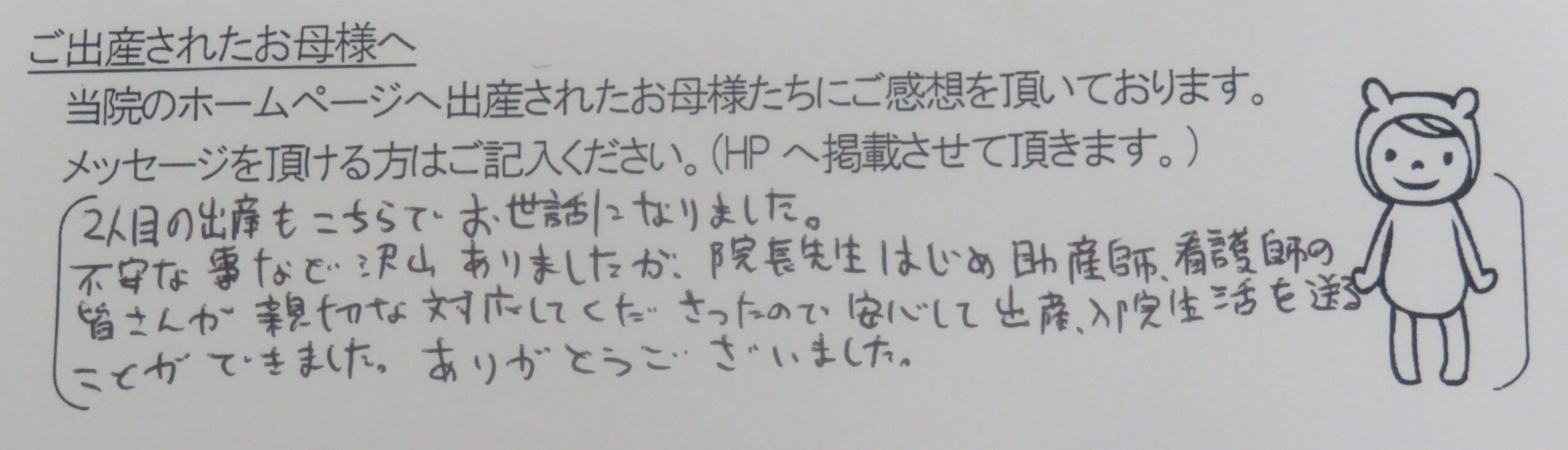 不安な事など沢山ありましたが、院長先生はじめ助産師、看護師の皆さんが親切な対応してくださったので安心して出産、入院生活を送ることができました。ありがとうございました。