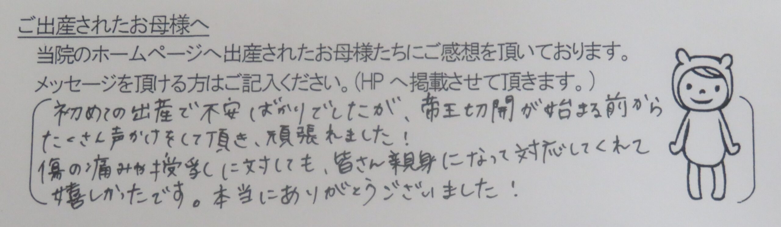 初めての出産で不安ばかりでしたが、帝王切開が始まる前からたくさん声かけをして頂き、頑張れました!<br />