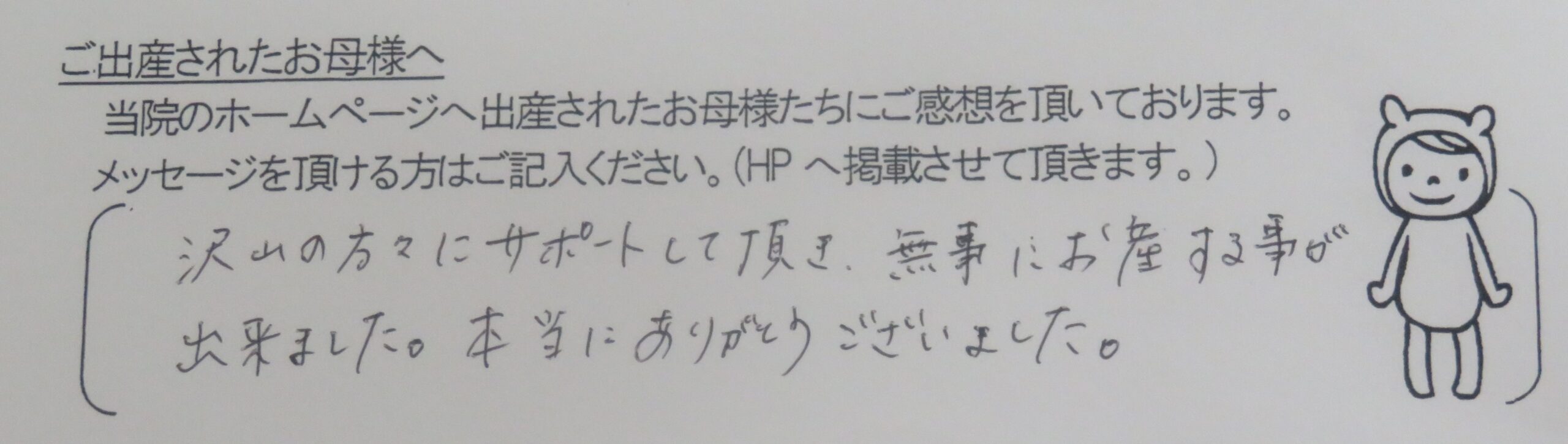 沢山の方々にサポートして頂き、無事にお産する事が出来ました。本当にありがとうございました。
