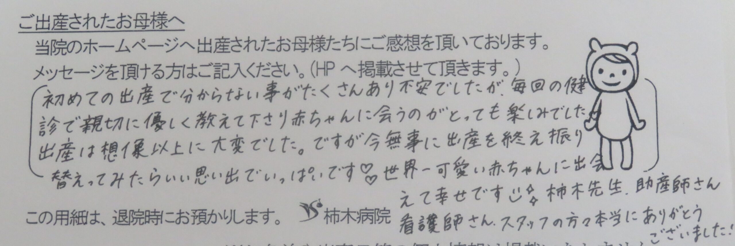 初めての出産で分からない事がたくさんあり不安でしたが、毎回の健診で親切に優しく教えて下さり、赤ちゃんに会うのがとっても楽しみでした。出産は想像以上に大変でした。ですが、今無事に出産を終え振り替えってみたらいい思い出でいっぱいです♡♡世界一可愛い赤ちゃんに出会えて幸せです☻柿木先生、助産師さん看護師さん、スタッフの方々本当にありがとうございました!!