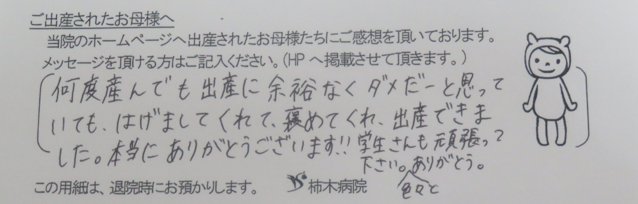 何度産んでも出産に余裕なくダメだーと思っていても、励ましてくれて褒めてくれ、出産出来ました。本当にありがとうございます!!学生さんも頑張って下さい。色々とありがとう。