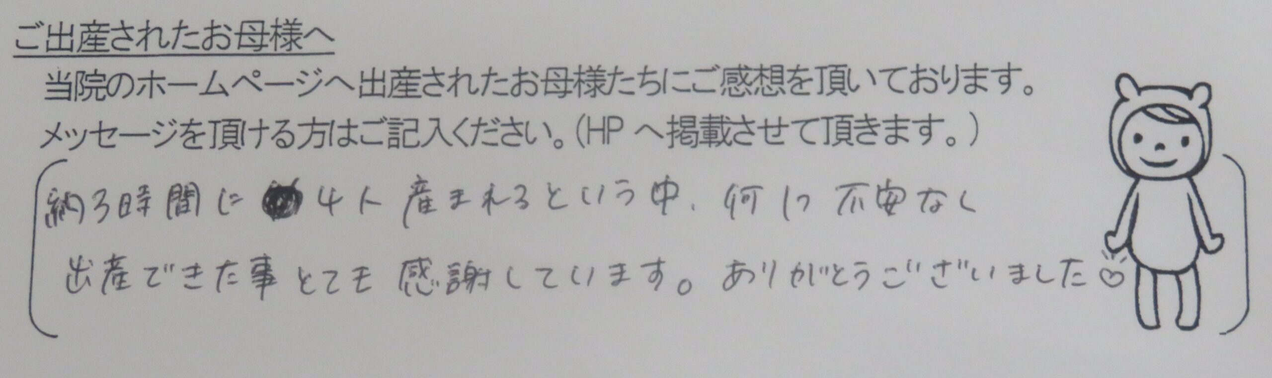 約3時間に4人産まれるという中、何1つ不安なく出産できた事とても感謝しています。ありがとうございました♡