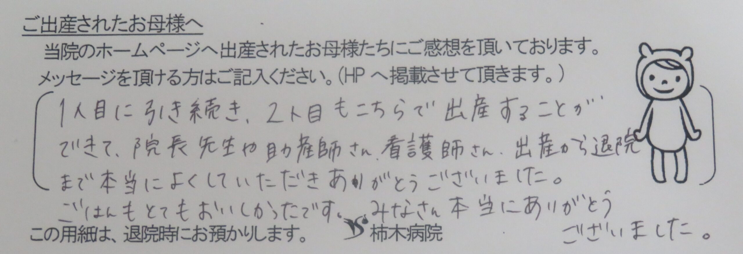 1人目に引き続き、2人目もこちらで出産することができて、院長先生や助産師さん、看護師さん、出産から退院まで本当によくして頂き、ありがとうございました。ご飯もとても美味しかったです。みなさん本当にありがとうございました。