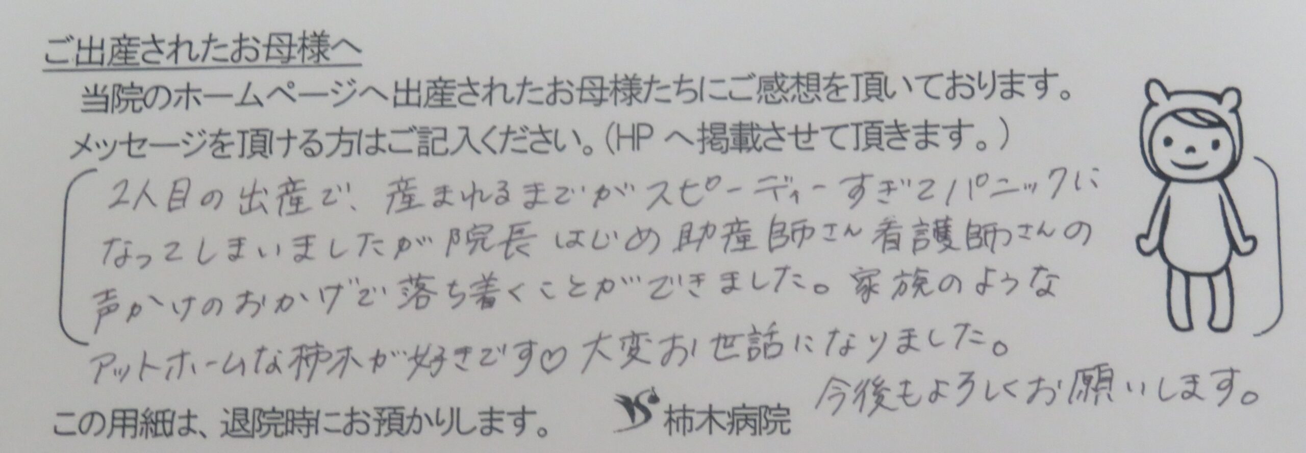 2人目の出産で産まれるまでがスピーディーすぎてパニックになってしまいましたが院長はじめ助産師さん看護師さんの声かけのおかげで落ち着くことができました。家族のようなアットホームな柿木が好きです♡大変お世話になりました。<br />