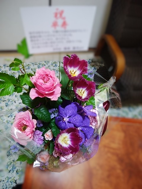卒寿の祝いに孫ひ孫たちからお花とメッセージカードのプレゼントがあり喜んでいました。