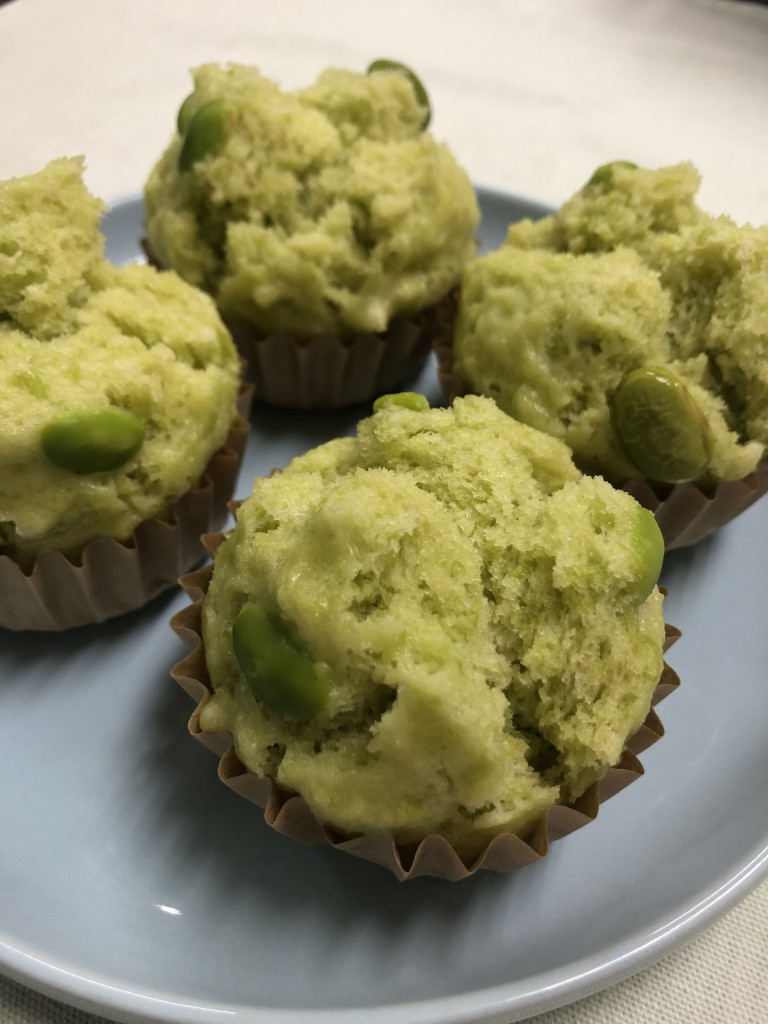 - 型に②の生地を入れて、上に飾り用にとっておいたむき枝豆をのせる。