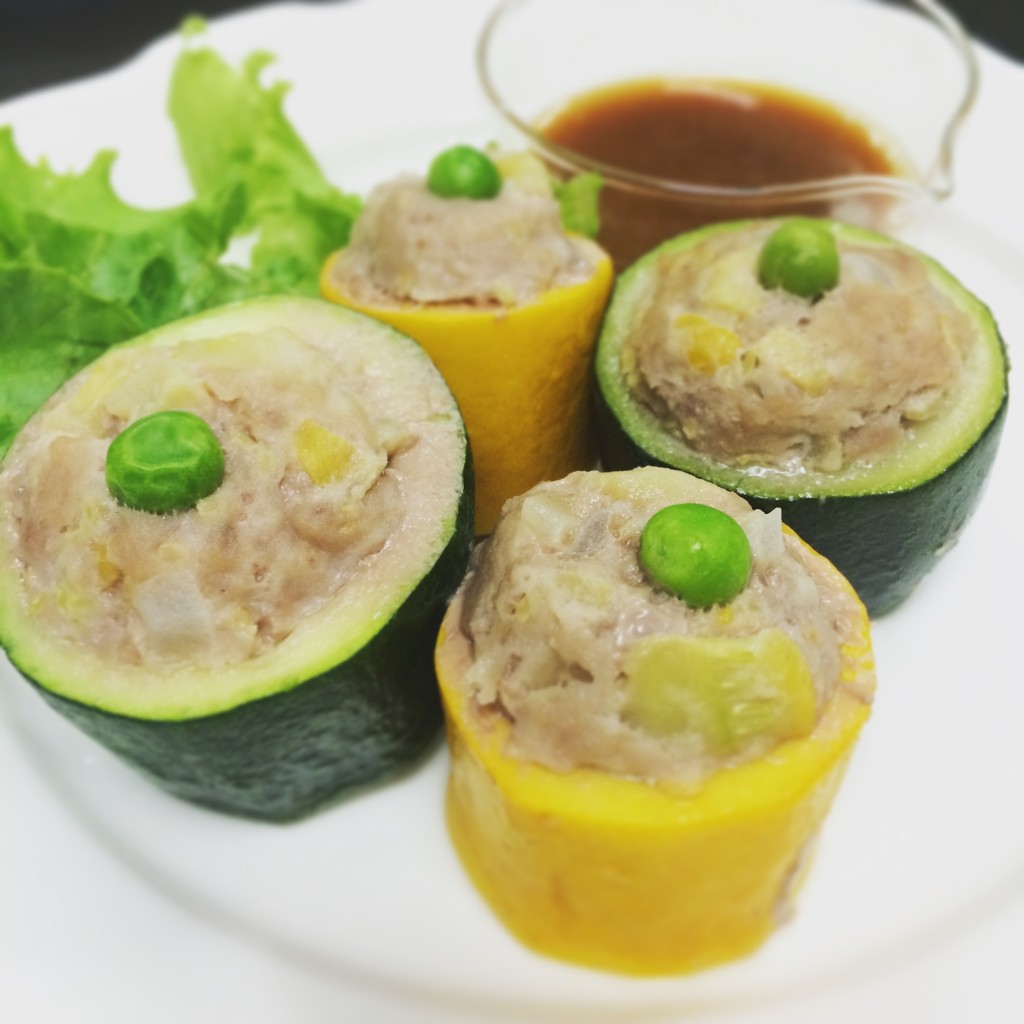 しゅうまいの皮を使わず、ズッキーニを器にすることでカロリーカットしています。