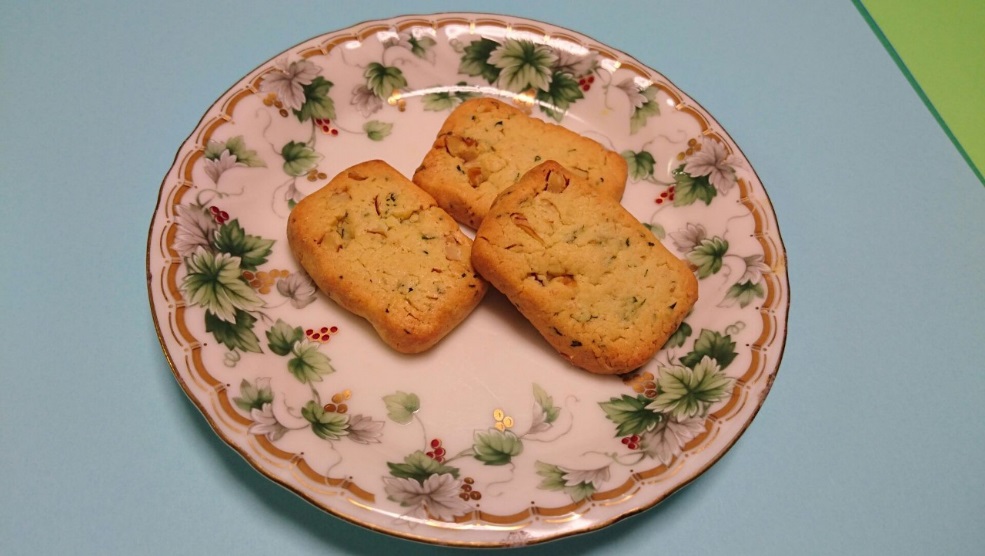 ③②とふるっておいた薄力粉、全粒粉、バジル、刻んでおいたくるみを混ぜる。生地をまとめて、大きく広げたラップに乗せ、生地を長方形に固め、30分冷凍庫に入れて寝かせる。