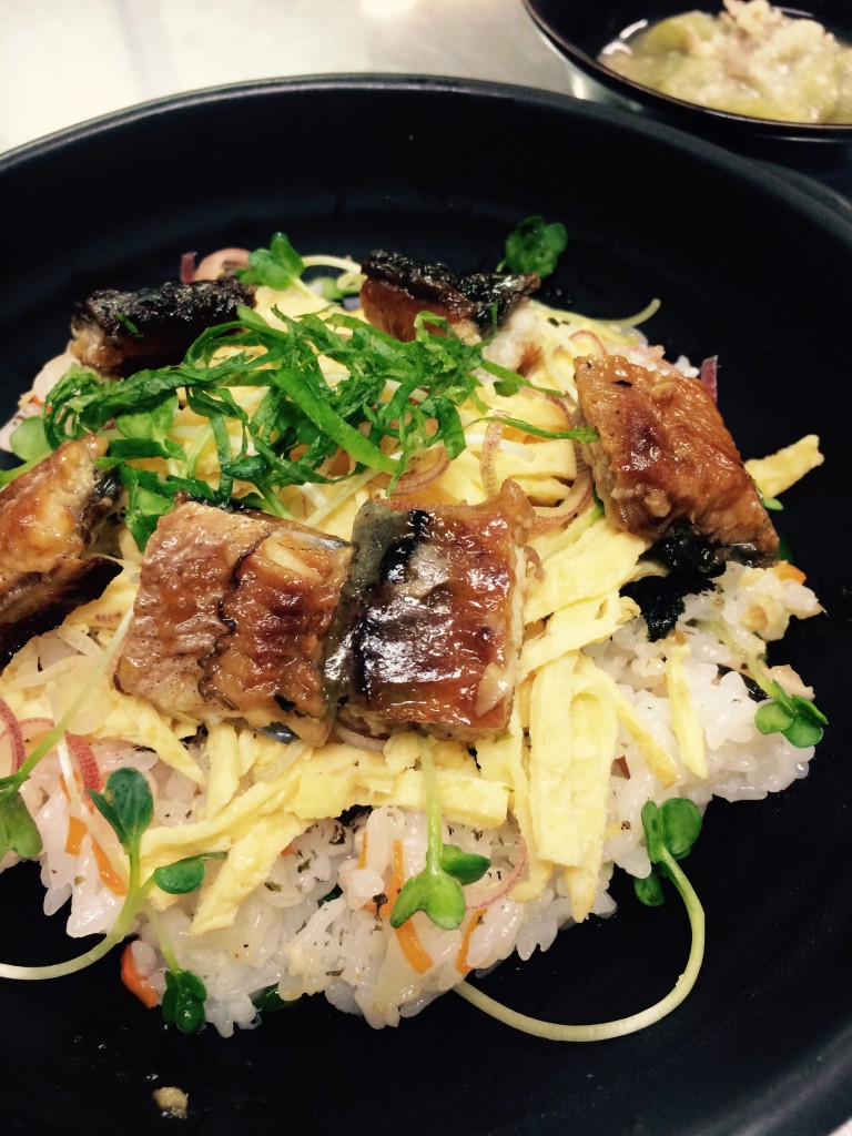 5. のり、錦糸卵、みょうが、かいわれ、うなぎの角切り、大葉をトッピングして完成!