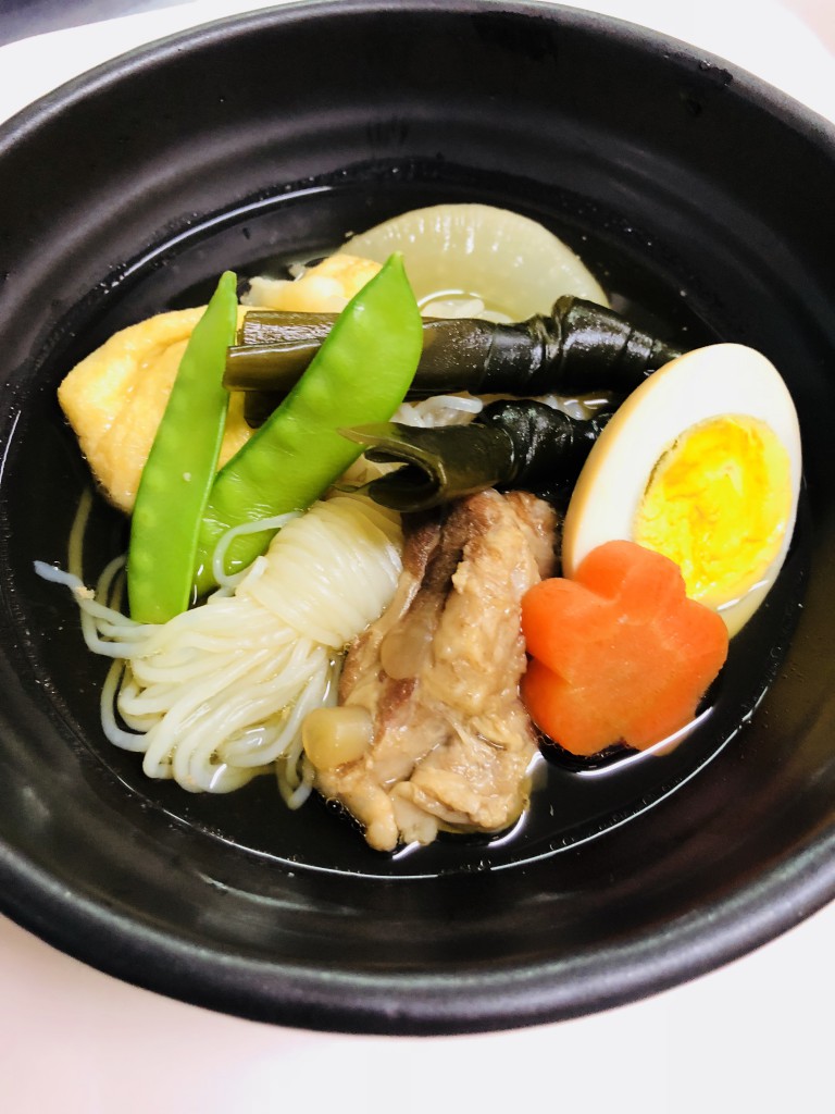 - 昆布だし水に、大根2cm長の輪切り、人参1cm長に切った野菜、むすび昆布を入れてゆでる。火が通ったらゆで卵、豚軟骨、むすびこんにゃく、もち巾着を入れて調味料を加えて味をしみこませていく。