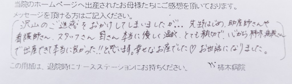 沢山のご迷惑をおかけしてしまいましたが・・・先生はじめ、助産師さんや看護師さん、スタッフさん皆さん本当に優しく温かく、とても親切で心から柿木病院さんで出産できて本当に良かった!!と思います。幸せなお産でした♡お世話になりました。