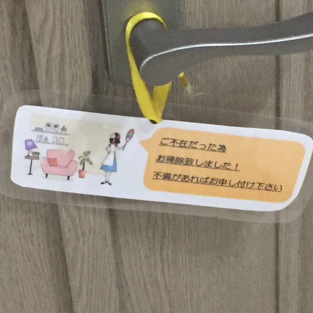 部屋を空けている方にも、不在時にお部屋に入って掃除をした事がわかるようにしたほうがいいと考え、このカードをドアノブにかけるようにしました。