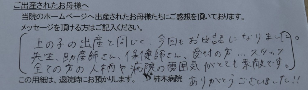 上の子の出産と同じく、今回もお世話になりました。先生、助産師さん、保健師さん、受付の方、、、スタッフ全ての方の人柄や病院の雰囲気がとても素敵です。ありがとうございました!!