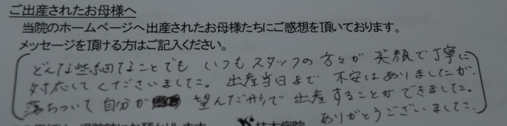 出産当日まで不安はありましたが、落ちついて自分が望んだ形で出産することができました。ありがとうございました。