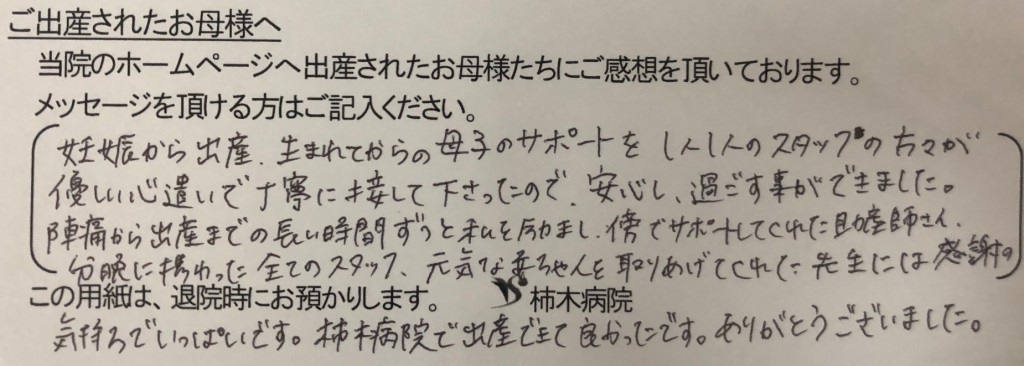 陣痛から出産までに長い時間ずっと私を励まし、傍でサポートしてくれた助産師さん、分娩に携わった全てのスタッフ、元気な赤ちゃんを取り上げてくれた先生には感謝の気持ちでいっぱいです。
