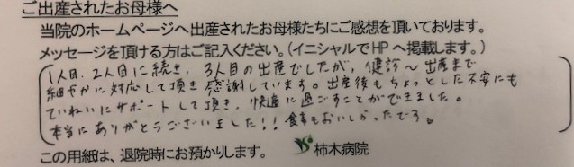 K.N様(2021年7月) 1人目、2人目に続き、3人目の出産でしたが、健診~出産まで細やかに対応して頂き感謝しています。出産後もちょっとした不安にもていねいにサポートして頂き、快適に過ごすことができました。本当にありがとうございました!!食事もおいしかったです♡