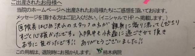 医院長はじめ沢山のスタッフの方が親身に寄り添ってくださりとても心強かったです。入院中も快適に過ごさせて頂き本当に良かったです!!ありがとうございました!!